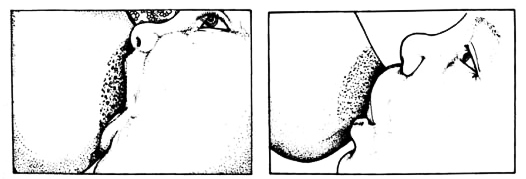 - Bocca ben aperta e spalancata, il neonato mette in bocca il seno, non solo il capezzolo, quindi in bocca deve avere buona parte dell’areola;